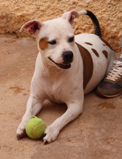 Atualmente convive com um companheiro de box, pelo que, à partida, poderá adaptar-se bem à presença de outros cães, mediante apresentações adequadas.